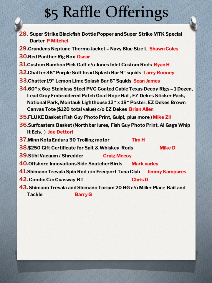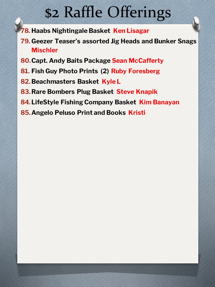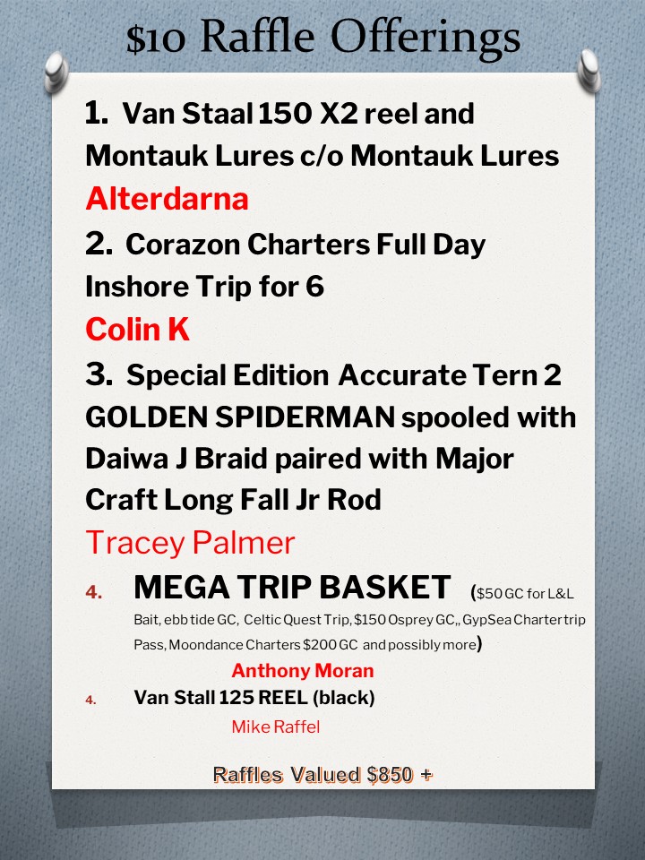 Raffles announced and displayed during the month of February through the club Instagram account…follow @patriotsfishing and here….