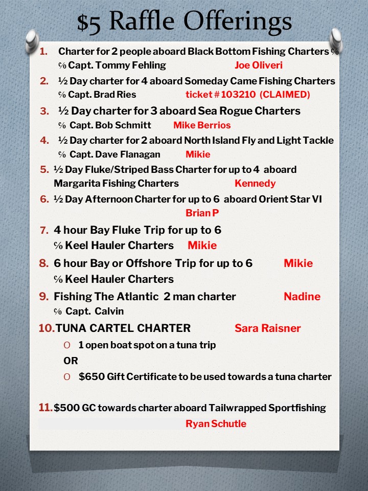 Since we do not charge admission to enter the show, the club raises funds through the selling of raffle tickets. All raffles are fishing related. We offer half day and full day fishing trips with some of the best charter boats, party boat captains and guides. You will also see custom rods and various reels in the raffle as well as fishing artwork, custom lures or all types and other assorted gear.